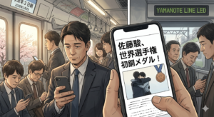 日本時間3月29日の朝。通勤電車の中でスマートフォンのニュースを開く人々は、中東の紛争による物価高の知らせや、居眠り運転による事故のニュースの間に、彼らが表彰台で肩を寄せ合って笑い合う写真を見つけるだろう。