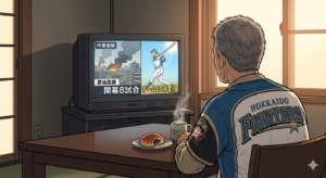 その日の夜。 エスコンフィールドの熱狂から冷めやらぬまま家路についたshimoは、再び自宅のテレビの前に座っていた。 画面の中では、朝と変わらず、世界の暗いニュースが続いている。 中東の戦火はさらに激しさを増し、原油価格の高騰は明日からのガソリン価格をさらに引き上げるだろう。インフレの波は止まらず、食糧事情も予断を許さない。社会は相変わらず不確実で、理不尽で、個人の力ではどうにもならない巨大な歯車に巻き込まれている。