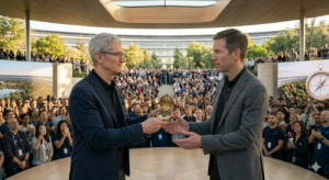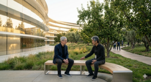 夕暮れ時、shimoはオフィスを出て、Apple Parkの中心にある広大な中庭を歩いていた。乾燥したカリフォルニアの風に揺れる、幾本ものリンゴの木々。この土地がまだ果樹園だった頃の記憶を受け継ぐその木々の下で、shimoはふと、見慣れたシルエットとすれ違った。